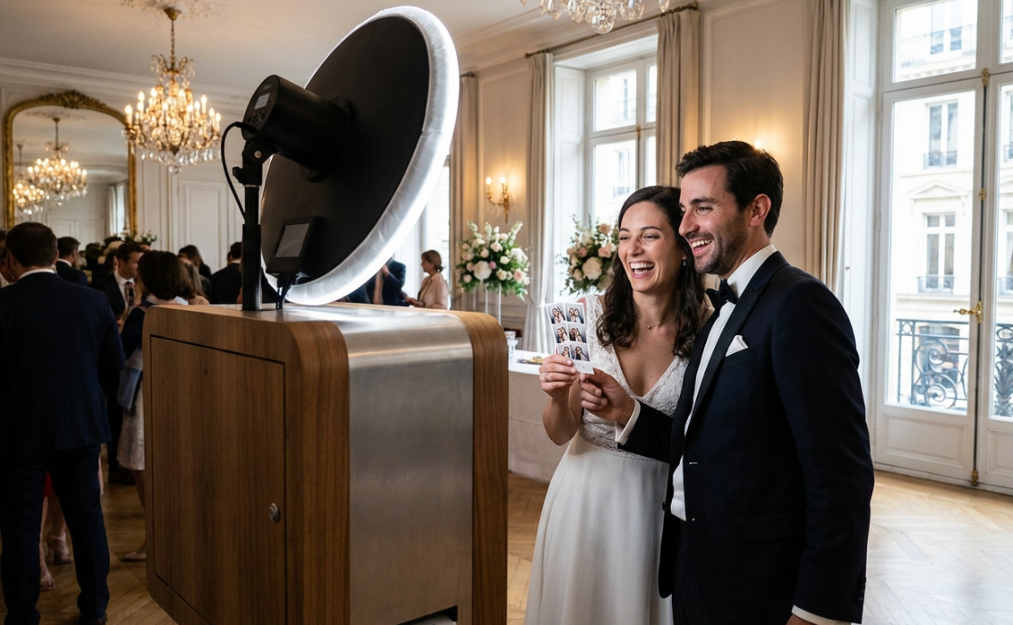 Nous utilisons un appareil photo Canon EOS R100, un flash cobra professionnel pour un rendu studio, ainsi qu’une imprimante DNP à sublimation thermique garantissant des impressions rapides et de haute qualité.